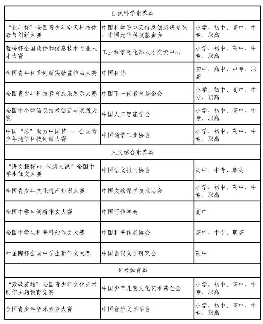 同时新增了“全国青少年人工智能大赛”在内的16项科学素养、人文素养、艺术体育类竞赛活动。